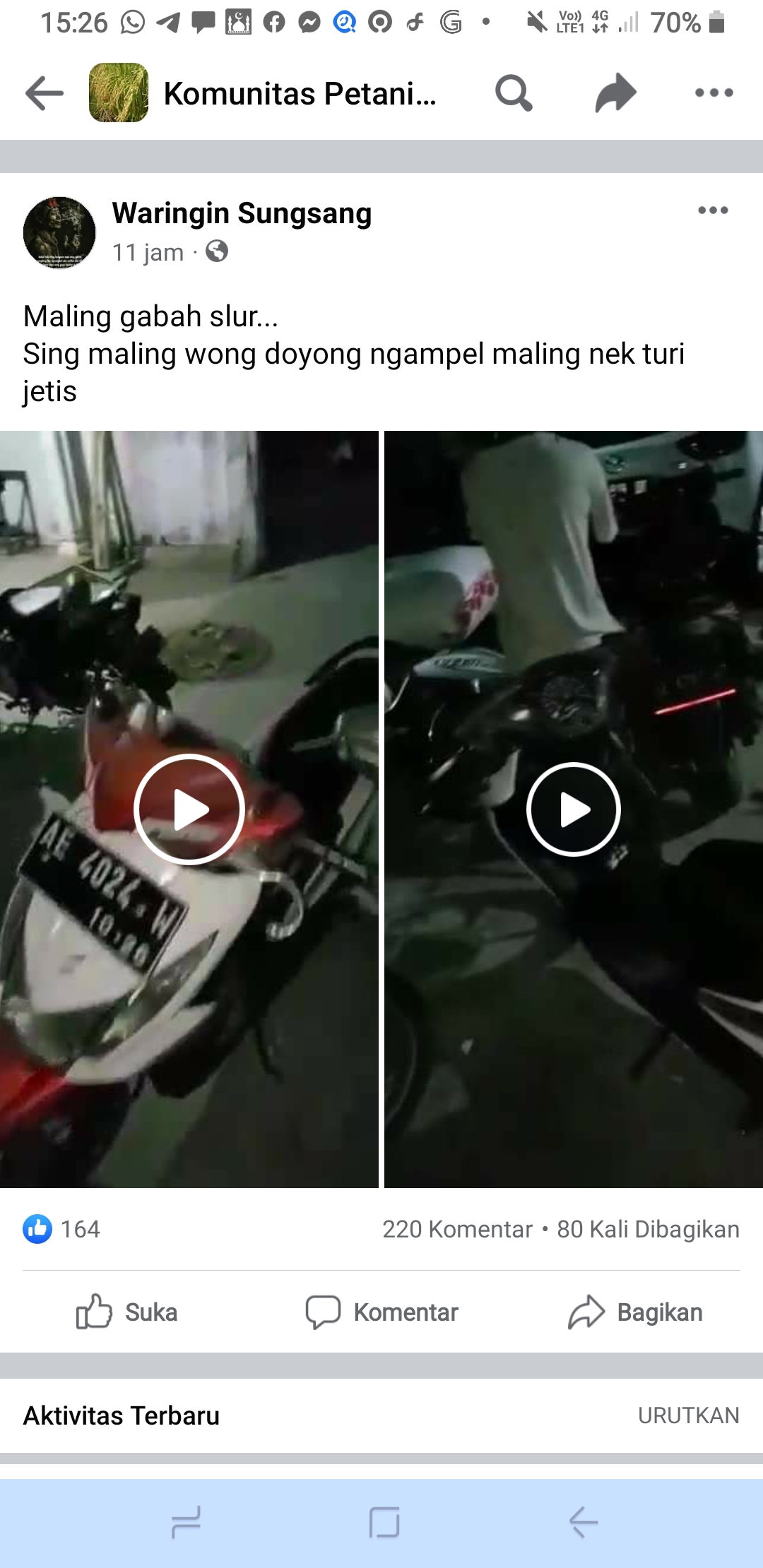 Akun yang mengunggah pun memberi caption "Maling gabah slur. Sing maling wong doyong ngampel maling nek turi jetis (Pencurian gabah dulur. Pencurinya warga Doyong, Ngampel. Dia mencuri di Desa Turi Jetis)".
