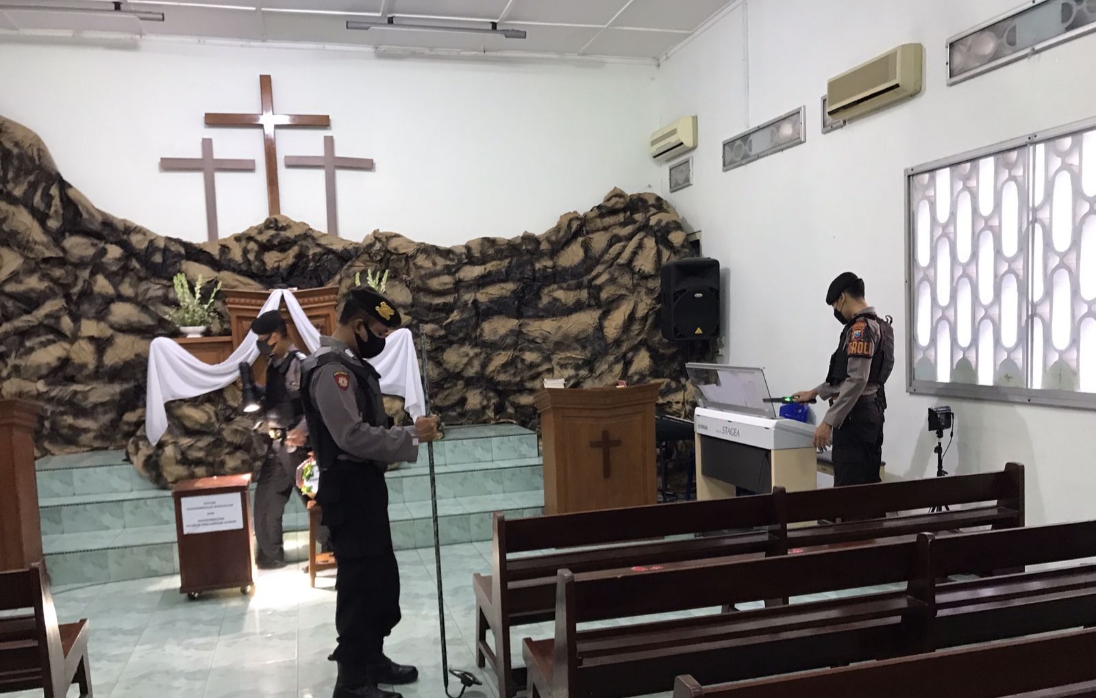 Menurut AKP Sujono, dalam pemeriksaan yang dilakukan pihaknya menyisir gereja, termasuk sterilisasi baik lingkungan di luar, di dalam, maupun di altar. "Tidak ada barang-barang yang ditemukan, steril dan aman. Nanti selain pengamanan di lokasi, juga akan melakukan patroli secara mobiling ke gereja-gereja atau tempat ibadah,” ucapnya.