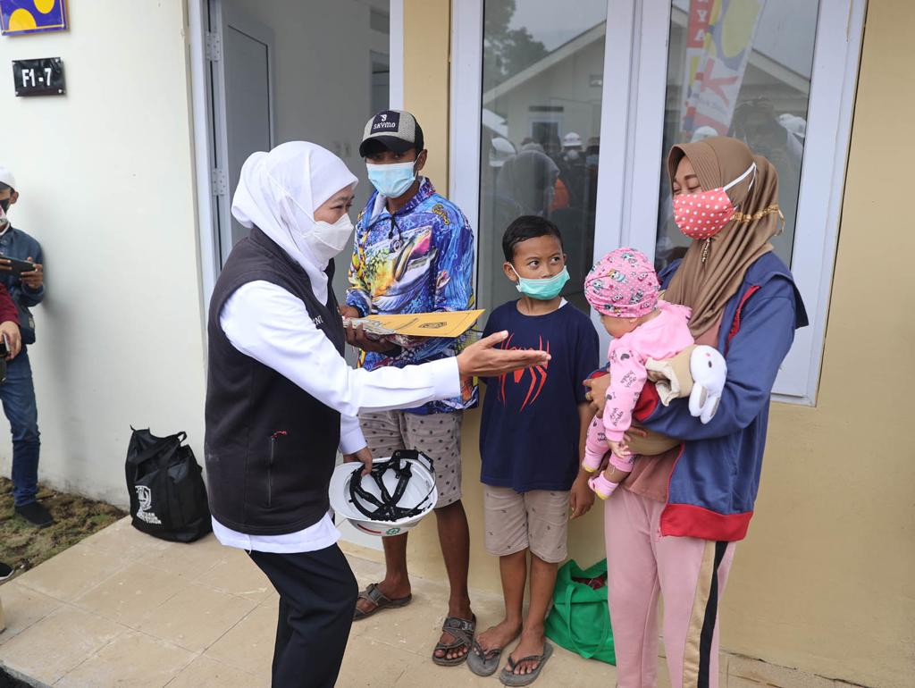 Bak kado jelang perayaan hari kemenangan Idul Fitri, Khofifah menyerahkan secara simbolis kunci rumah kepada 7 orang penghuni beserta sembako dan sajadah serta majmuk syarif untuk masing-masing rumah. Totalnya ada sebanyak 130 KK yang dipindahkan dari pengungsian untuk menghuni huntara dan huntap hari ini.