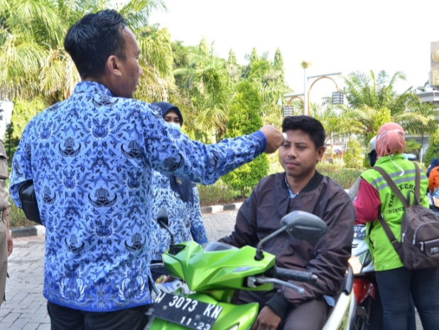 KLIKJATIM.Com | Gresik - Upaya pencegahan terhadap penyebaran covid-19 di lingkungan Pemda Kabupaten Gresik terus dilakukan. Selain penyemprotan disinfektan, Bupati Gresik Sambari Halim Radianto juga mewajibkan semua Aparatur Sipil Negara (ASN) yang masuk kantor harus dites suhu tubuhnya menggunakan thermo gun.