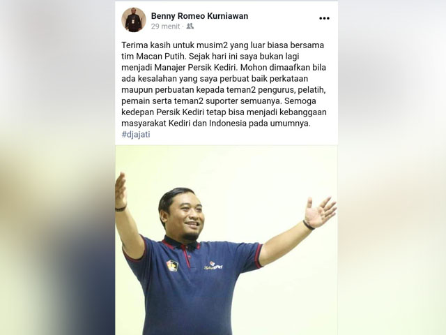 KLIKJATIM.com | Kediri - Setelah didemo suporter, Manager Persik Kediri, Benny Kurniawan mengundurkan diri dari jabatannya. Langkah tersebut ditempuh Benny melalui postingan di media sosial, yakni akun Instagram dan Facebook.