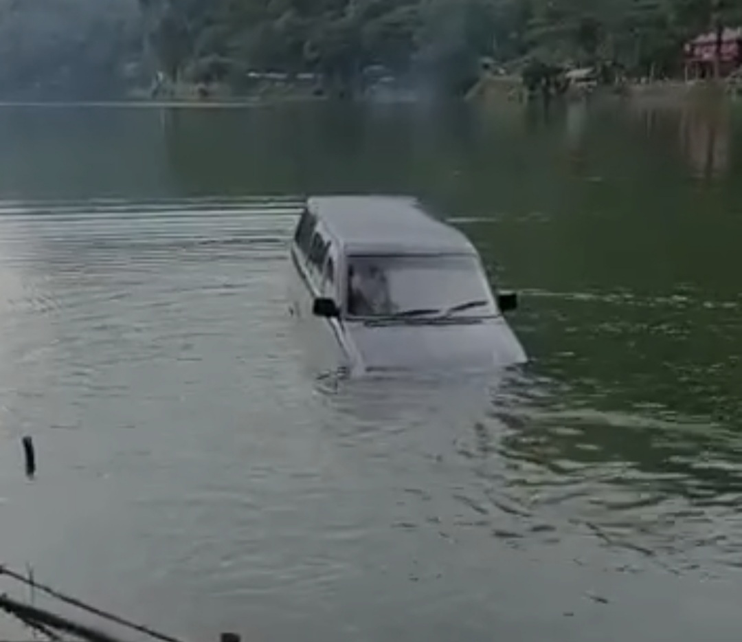 KLIKJATIM.Com | Ponorogo - Sebuah mobil jenis Kijang LGX yang terparkir di salah satu rumah makan Telaga Ngebel mundur sendiri, Jumat (3/6/2022). Hingga menyebabkan mobil berwarna hitam itu tenggelam di Telaga Ngebel.