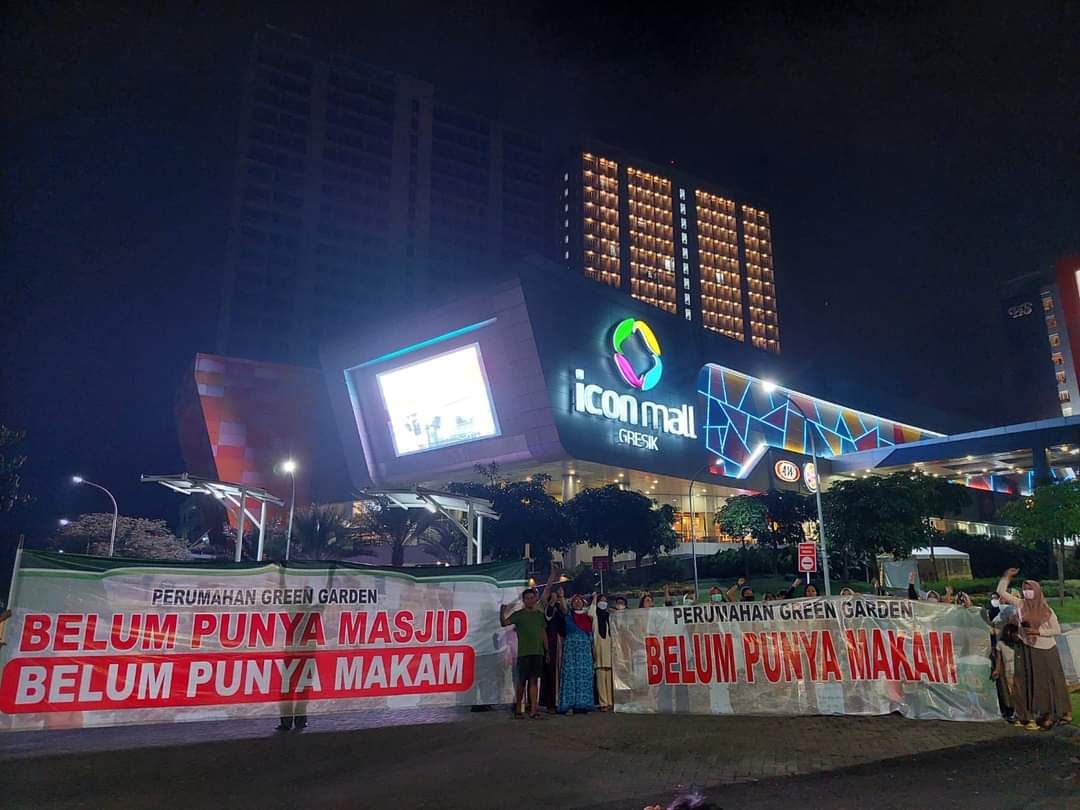 Buntunya perundingan ini membuat warga geram. Puncaknya, mereka demo memasang banner tuntutan penyediaan lahan makam dan masjid pada Senin (20/6/2022). Bapak ibu dan anak anak keluar rumah berkumpul di depan gerbang perumahan yang menyatu dengan akses masuk Icon Mall dan Apartemem Icon.