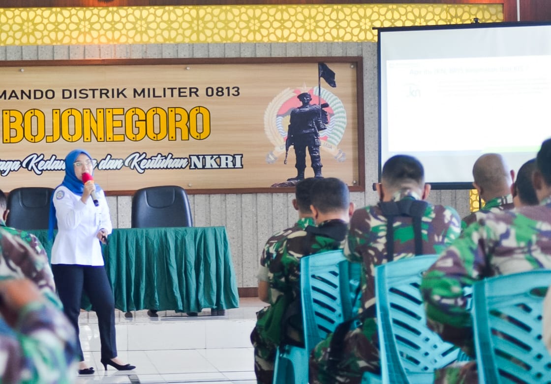 KLIKJATIM.Com | Bojonegoro - Dalam rangka meningkatkan mutu layanan pemahaman hak dan kewajiban peserta JKN KIS khususnya bagi anggota TNI AD, Badan Penyelenggara Jaminan Sosial (BPJS) Kesehatan Bojonegoro melaksanakan sosialisasi tentang hak, kewajiban dan alur pelayanan kesehatan serta penjaminan kecelakaan kepada anggota Kodim 0813 Bojonegoro.