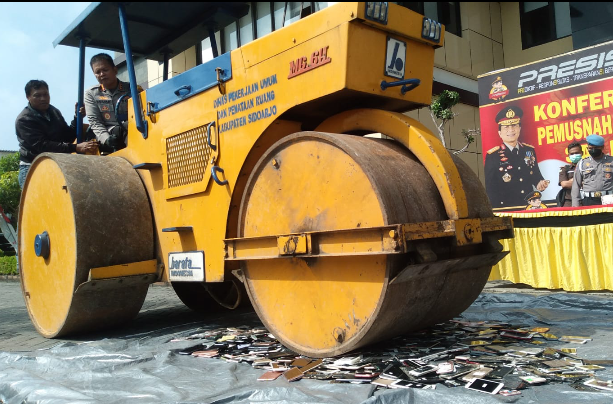 Pemusnahan disaksikan oleh pihak Kejaksaan Negeri (Kejari) dan Pengadilan Negeri (PN) Sidoarjo. Ratusan iphone itu dimusnahkan menggunakan alat berat jenis selinder dengan cara digilas hingga seluruhnya hancur.