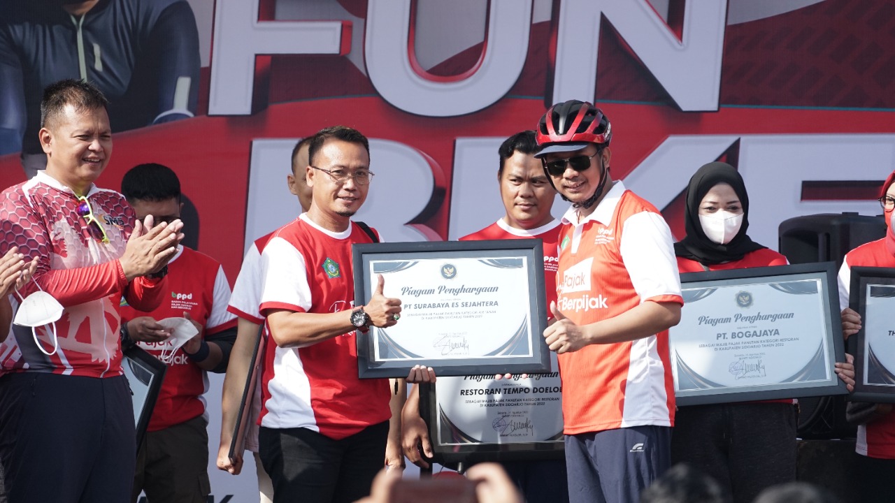 KLIKJATIM.Com | Sidoarjo – Bupati Sidoarjo, Ahmad Muhdlor mengapresiasi kepada para wajib pajak yang tertib dalam membayar pajaknya. Pemberian penghargaan kepada para wajib pajak panutan itu diserahkan Bupati yang akrab disapa Gus Muhdlor usai gowes di Alun-alun pada Minggu (21/8/2022).