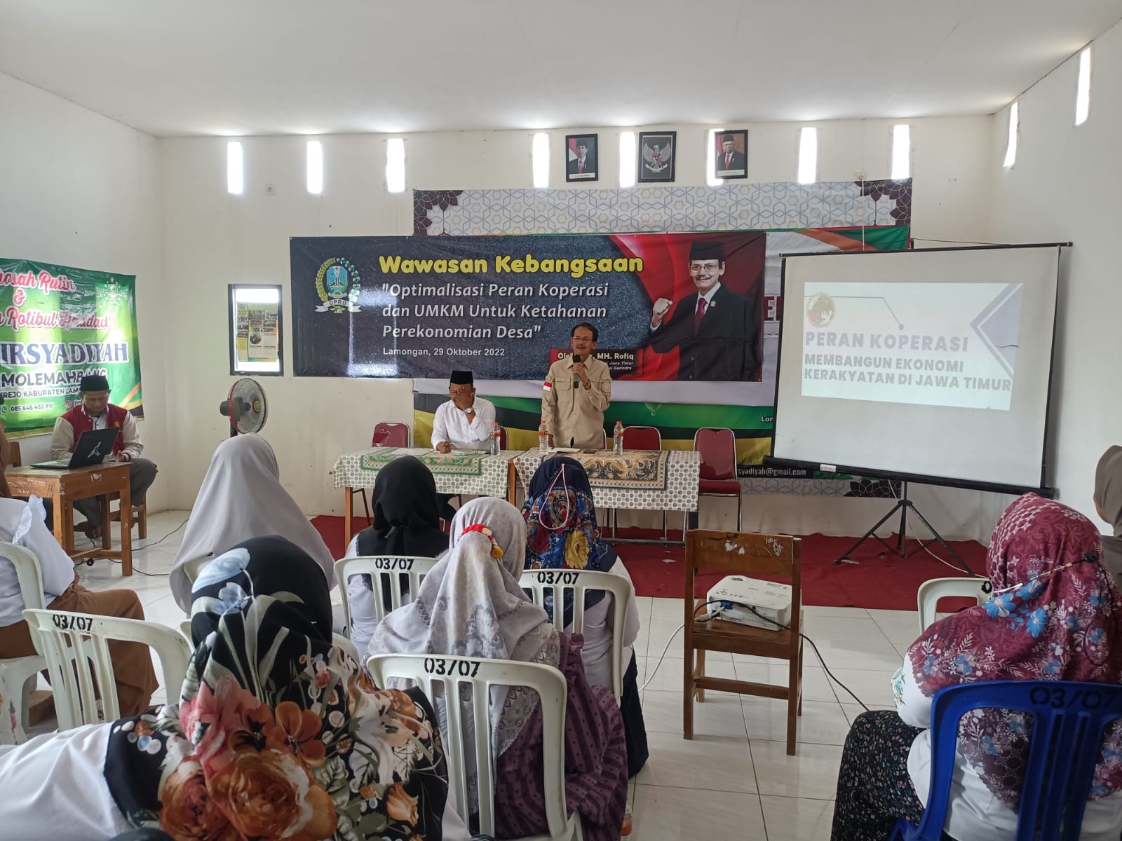 KLIKKATIM.Com | Lamongan - Bertajuk Optimalisasi peran koperasi dan UMKM untuk ketahanan perekonomian desa, anggota DPRD Jawa Timur fraksi Gerindra Drs. MH. Rofiq menggelar wawasan kebangsaan. Kegiatan tersebut menyasar warga Kecamatan Sarirejo pada Sabtu (29/10/2022) di aula MTS Al- Irsyadiyah, Dusun Lemahbang, Desa Dermolemahbang, Kecamatan Sarirejo, Lamongan.