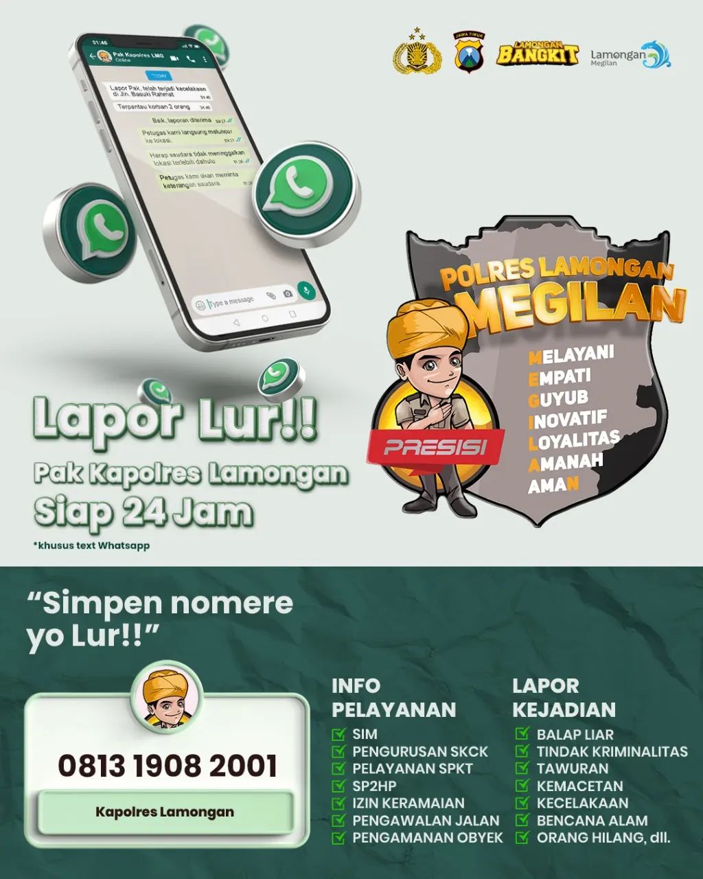 KLIKJATIM.Com | Lamongan - Guna meningkatkan Pelayanan Publik, Polres Lamongan ciptakan Inovasi untuk lapor langsung ke Pak Kapolres. Aplikasi tersebut bernama Lapor Lur Pak Kapolres Lamongan yang siap 24Jam dimana seluruh warga masyarakat terutama di wilayah Kabupaten Lamongan bisa melapor atau bahkan curhat masalah yang sedang dialami langsung melalui aplikasi whatsApp dengan nomor Kapolres Lamongan yang sudah tertera yaitu di 081319082001.