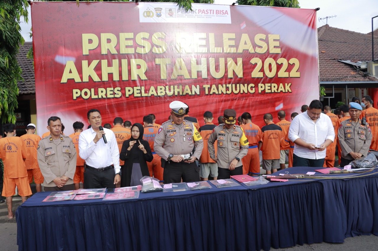KLIKJATIM.Com | Surabaya - Polres Pelabuhan Tanjung Perak Surabaya, Polda Jatim, mengungkap 250 kasus penyalahgunaan peredaran narkoba selama Januari hingga akhir tahun 2022. Dari jumlah kasus itu, polisi mengamankan 316 orang tersangka dengan barang bukti 40 kilogram sabu.