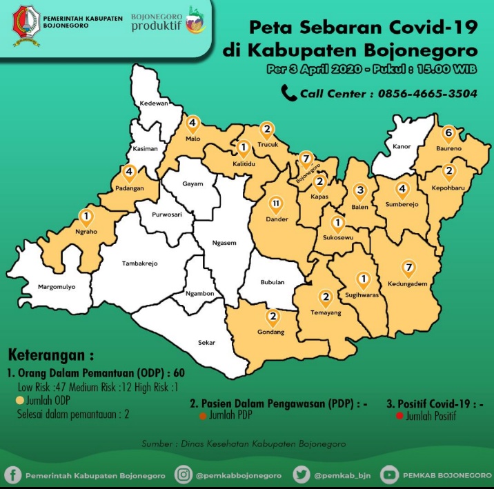 Untuk peta sebaran ODP di Kabupaten Bojonegoro meliputi Kecamatan Dander 11 orang, Kecamatan Bojonegoro 7 orang, Kecamatan Kedungadem 7 orang, Kecamatan Baureno 6 orang, Kecamatan Sumberrejo 4 orang, Kecamatan Malo 4 orang, Kecamatan Padangan 4 orang, dan Kecamatan Balen 3 orang,