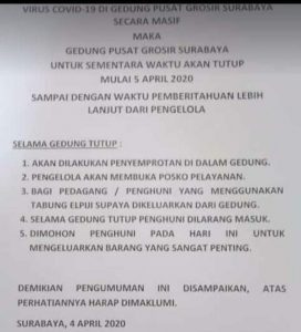 Isinya memberitahukan jika ada empat orang penderita yang berdasarkan diagnosa dari Dinas Kesehatan dinyatakan positif covid-19. Empat orang itu bekerja dan memiliki toko di lantai 2, 3 dan 4 PGS yang berlokasi di Jalan Raya Dupak, Bubutan, Surabaya.