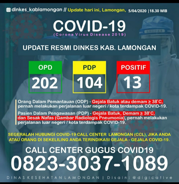 Sementara itu, update terbaru kasus covid-19 per Minggu (5/4/2020) di Kabupaten Lamongan tercatat sebanyak 202 Orang Dalam Pemantauan (ODP), 104 Pasien Dalam Pengawasan (PDP), 13 Positif Covid-19. Sehingga kabupaten Lamongan masuk zona merah di peringkat ketiga se-Jatim setelah Surabaya dan Sidoarjo. (bis/mkr)