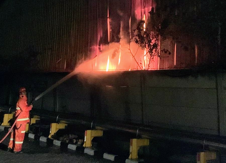 KLIKJATIM.Com | Gresik - Kebakaran melanda sebuah gudang aspal curah milik PT Multi Trading Pratama yang terletak di Kompleks Pelabuhan Gresik yang dikelola Pelindo, di Desa Pulopancikan, Senin malam 8 Januari 2024.