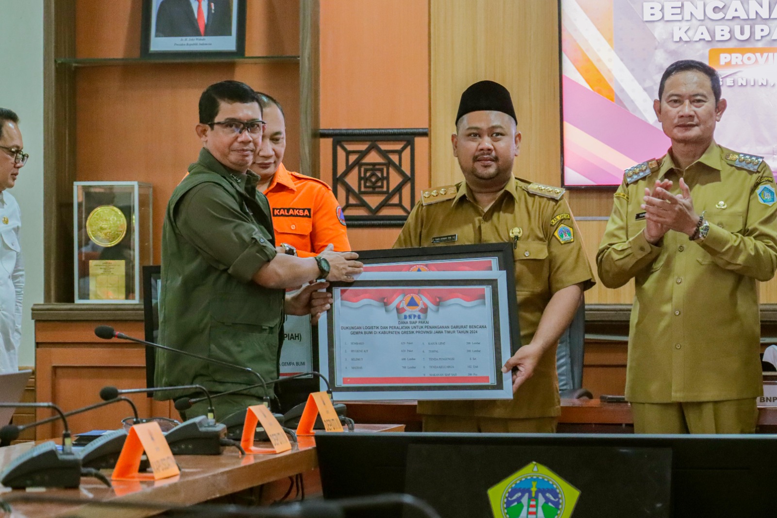Rapat koordinasi percepatan penanganan gempa Bawean digelar di Aula Graita Eka Praja Kantor Pemkab Gresik yang juga dihadiri oleh PJ Gubernur Provinsi Jawa Timur Adhy Karyono, pimpinan daerah kab/kota yang terdampak gempa Bawean, serta jajaran Forkopimda Kabupaten Gresik.