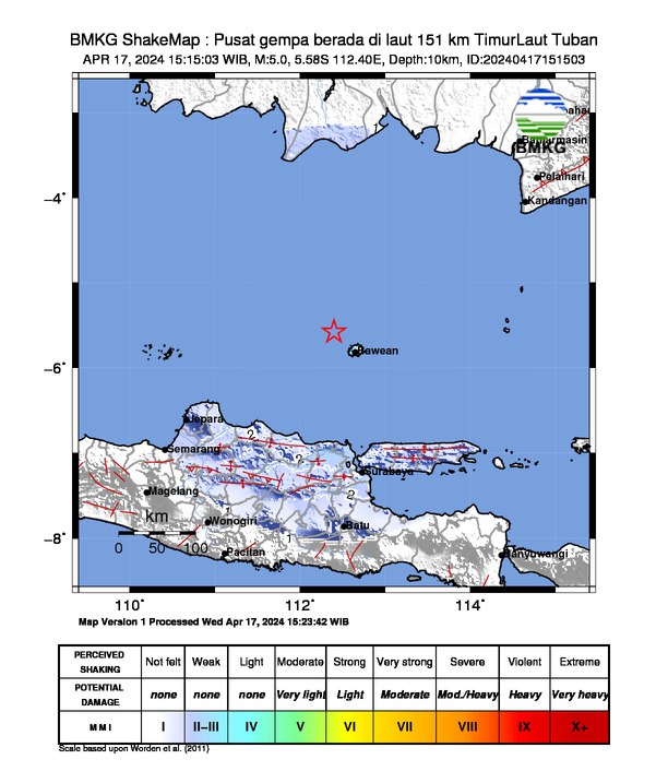 Kepala Pusat Gempabumi dan Tsunami BMKG, Dr Daryono, S.Si., M.Si, melalui siaran tertulisnya, Rabu Rabu (17/4/2024), menjelaskan, hasil analisis BMKG menunjukkan gempabumi ini memiliki parameter update dengan magnitudo M4,9. Episenter gempabumi terletak pada koordinat 5,83° LS ; 112,31° BT, atau tepatnya berlokasi di laut pada jarak 122 Km arah TimurLaut Tuban, Jawa Timur pada kedalaman 10 km.