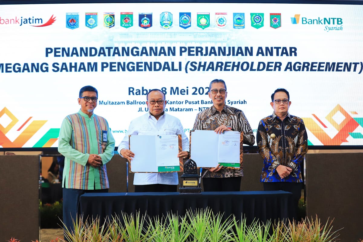 Penandatanganan shareholder agreement ini dilakukan oleh Pj. Gubernur NTB dengan Dirut Bank Jatim, dan Dirut Bank NTB Syariah dengan Dirut Bank Jatim di Multazam Ballroom Gedung Kantor Pusat Bank NTB Syariah Mataram, Rabu (8/5).