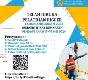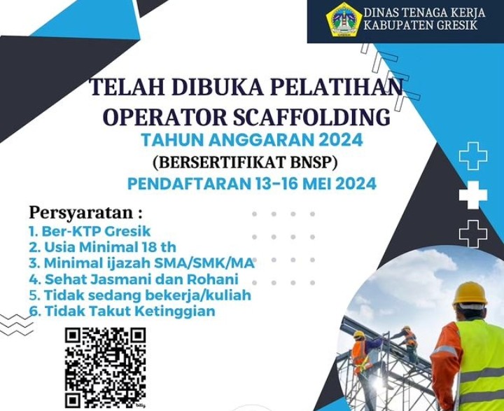 KLIKJATIM.Com | Gresik - Dinas Ketenagakerjaan Pemkab Gresik akan menggelar pelatihan Operator Scaffolding dan Rigger dalam waktu dekat. Pendaftaran kedua pelatihan bersertifikat BSNP dan Kemenaker tersebut telah dibuka 13 hingga 16 Mei 2024.