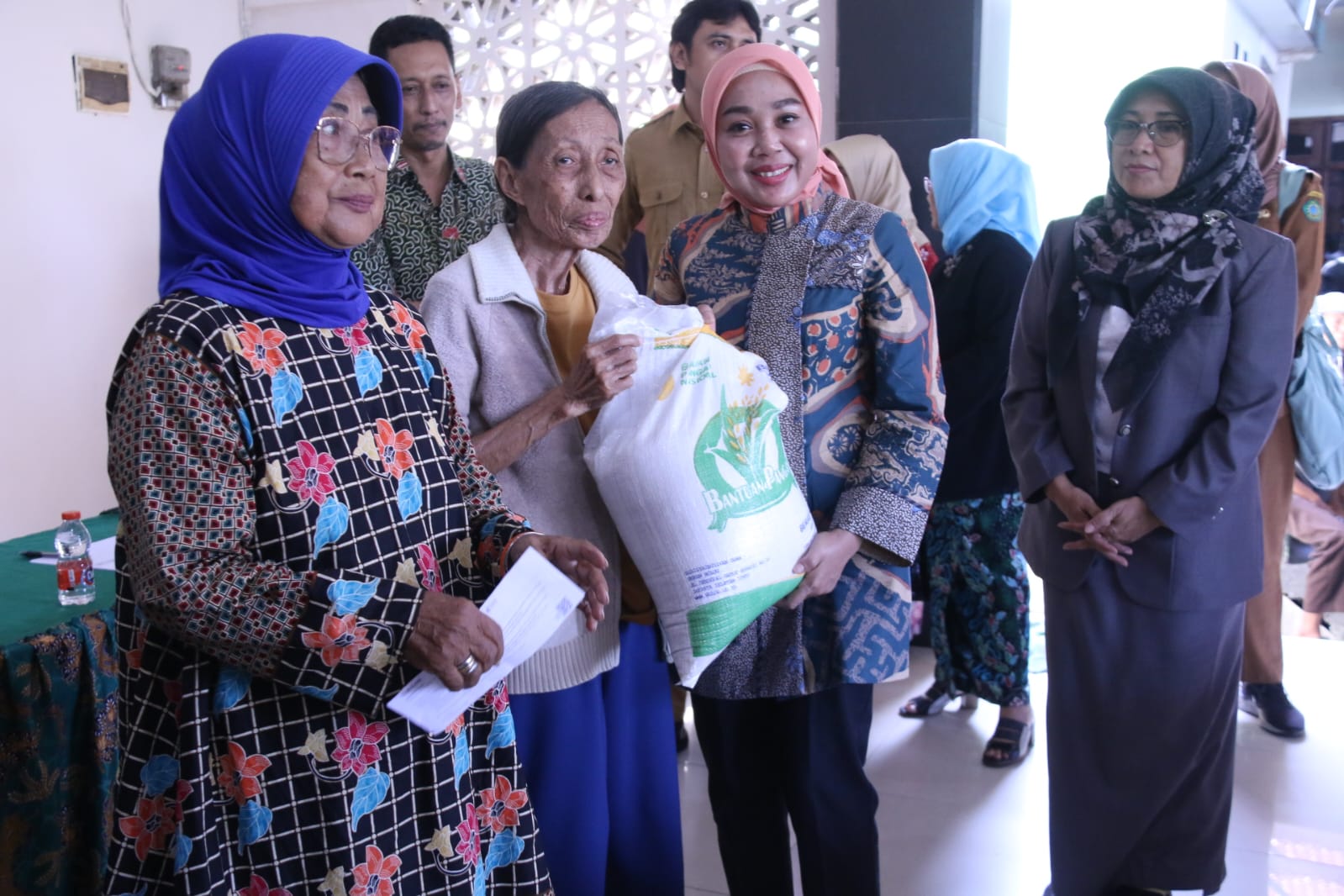dr. Hj. Sriatun Subandi, mantan Kepala Desa Pabean, Sedati, yang juga istri dari Plt. Bupati Sidoarjo, turut menghadiri penyerahan bantuan pangan beras, Senin (20/5) di Kecamatan Waru.