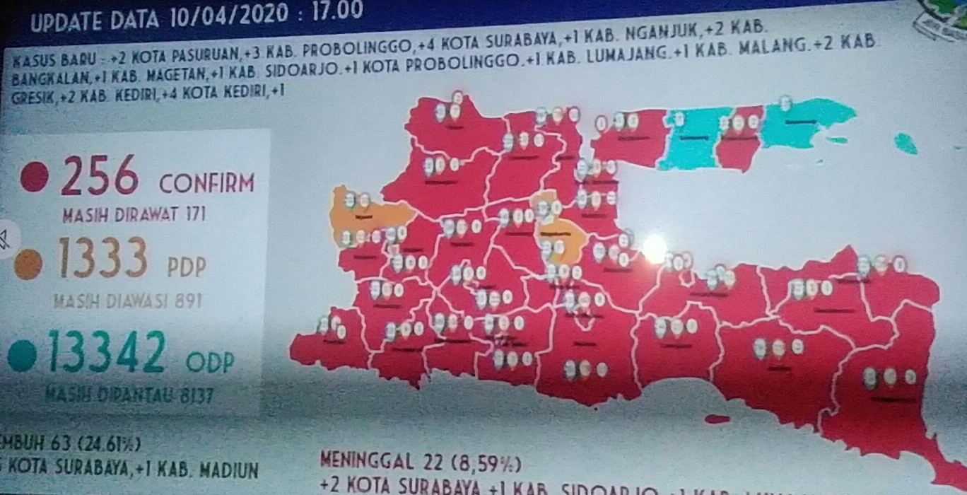 Dengan tamabahan 33 pasien positif di Jatim, saat ini total ada 256 pasien positif covid-19 di Jatim. Selain itu 1.333 Pasien dalam pengawasan (PDP) dan orang dalam pengawasan (ODP) ada 13.342.