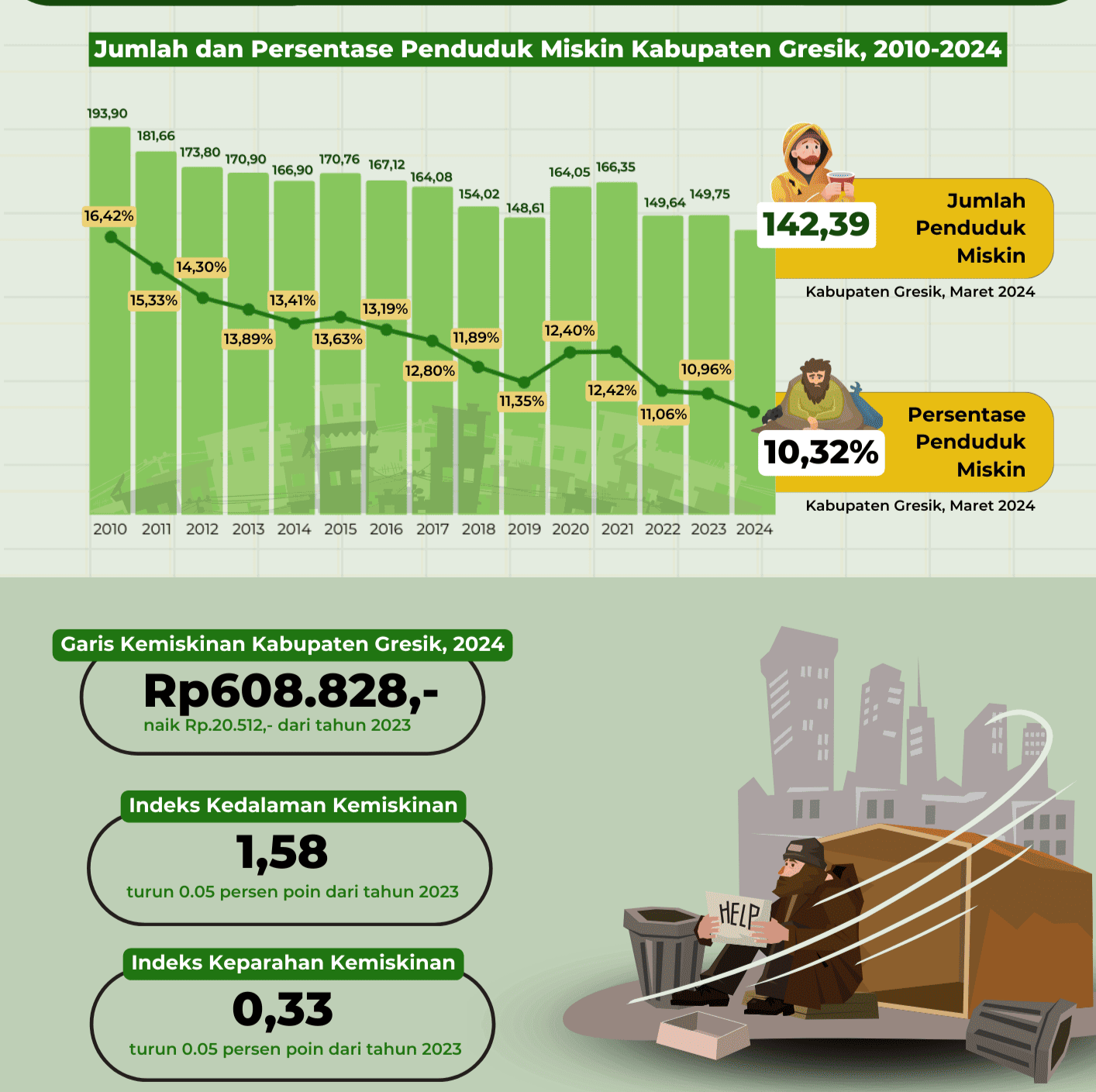 Jika dibandingkan dengan angka kemiskinan Provinsi Jawa Timur, selama tiga tahun terakhir Kabupaten Gresik berhasil menunjukkan penurunan kemiskinan yang lebih signifikan sebesar 2,10% sejak tahun 2021 hingga 2024. Sementara itu, Provinsi Jawa Timur berhasil menurunkan angka kemiskinan sebesar 1,61�lam periode yang sama.