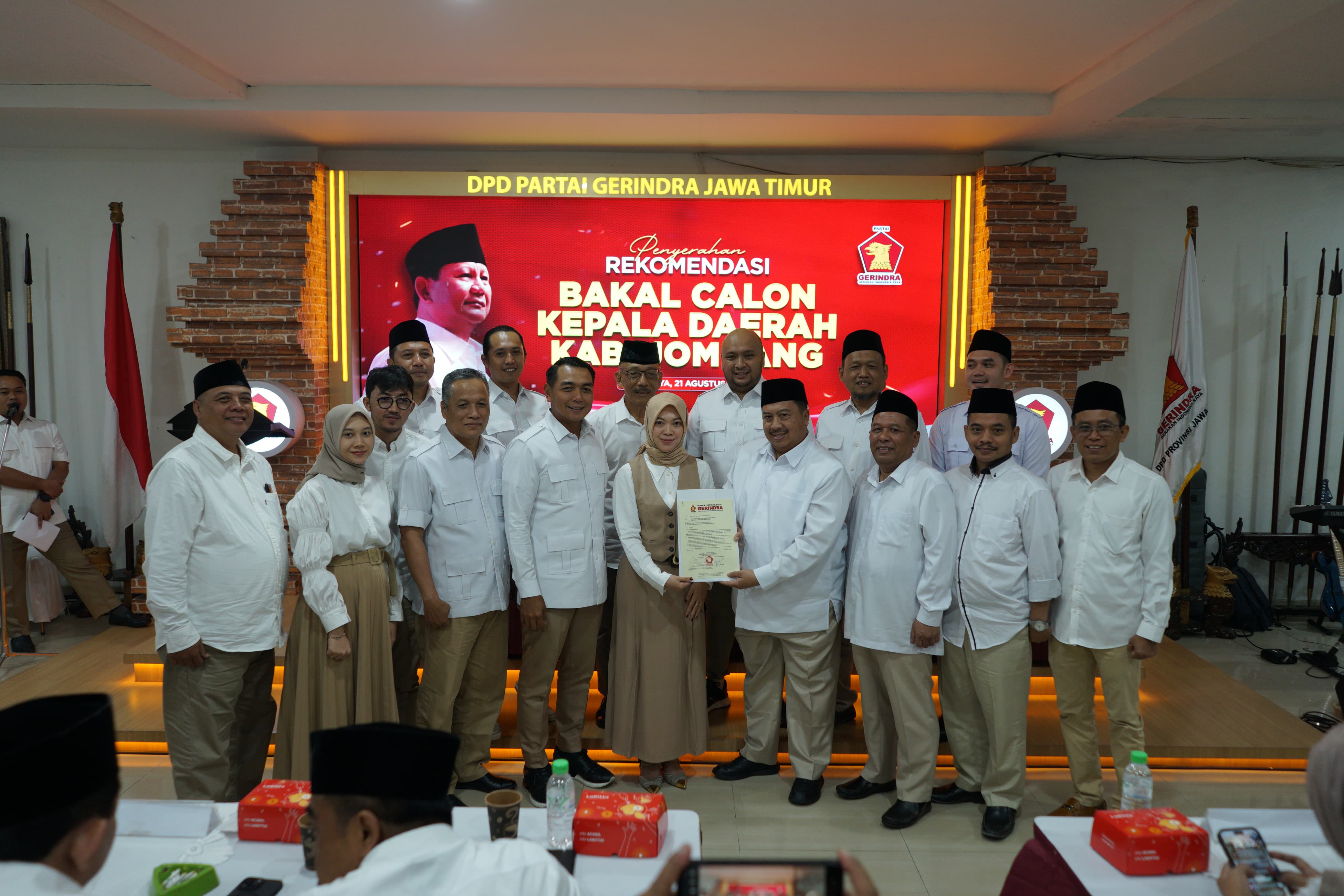 Penyerahan rekomendasi DPP Partai Gerindra diberikan kepada Warsubi dan Gus Salman sapaan akrabnya di kantor DPD Partai Gerindra Jawa Timur (Jatim) di Surabaya, Rabu (21/8/2024) malam, dan langsung diserah terimakan kepada pasangan bakal calon, melalui Sekretaris DPD Gerindra Jawa Timur Kharisma Febriansyah kepada Ketua DPC Jombang Octadella Bilytha Permatasari.