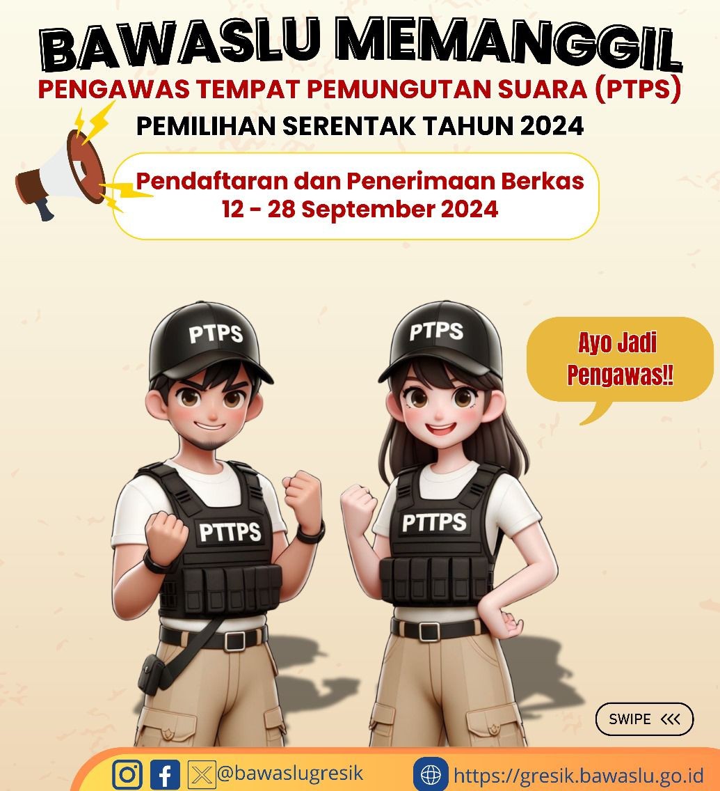 KLIKJATIM.Com | Gresik - Badan Pengawas Pemilu (Bawaslu) Kabupaten Gresik membuka lowongan Pengawas TPS (Tempat Pemungutan Suara) untuk pemilihan Gubernur dan Wakil Gubernur, Bupati dan Wakil Bupati Kabupaten Gresik yang akan digelar pada Rabu, 27 November 2024 mendatang.