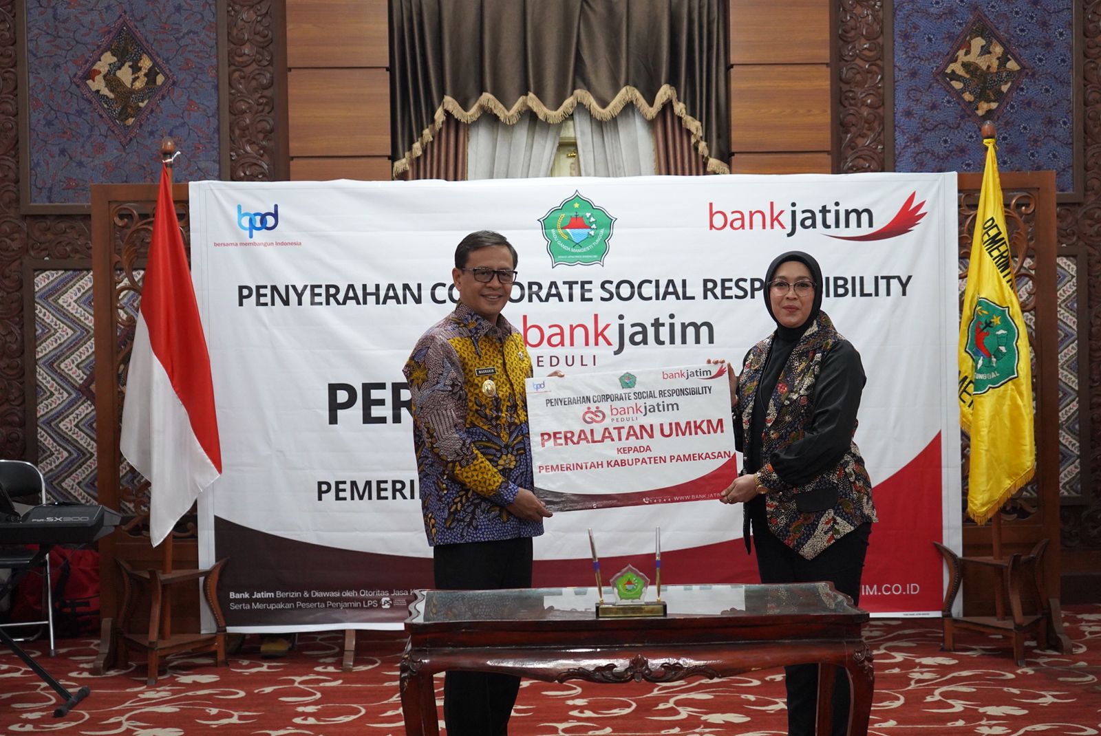 KLIKJATIM.Com | Pamekasan - Sebagai wujud upaya mendukung kemajuan UMKM, PT Bank Pembangunan Daerah Jawa Timur Tbk atau biasa disebut Bank Jatim (bankjatim) baru saja menyerahkan bantuan Corporate Social Responsibility (CSR) kepada Pemerintah Kabupaten Pamekasan berupa peralatan penunjang untuk UMKM. Bertempat di Pendopo Kabupaten Pamekasan, penyerahan bantuan CSR tersebut diserahkan secara simbolis oleh Pemimpin bankjatim Cabang Pamekasan Dian Libriyanti kepada Pj Bupati Pamekasan Masrukin pada hari Rabu 14 November 2024.
