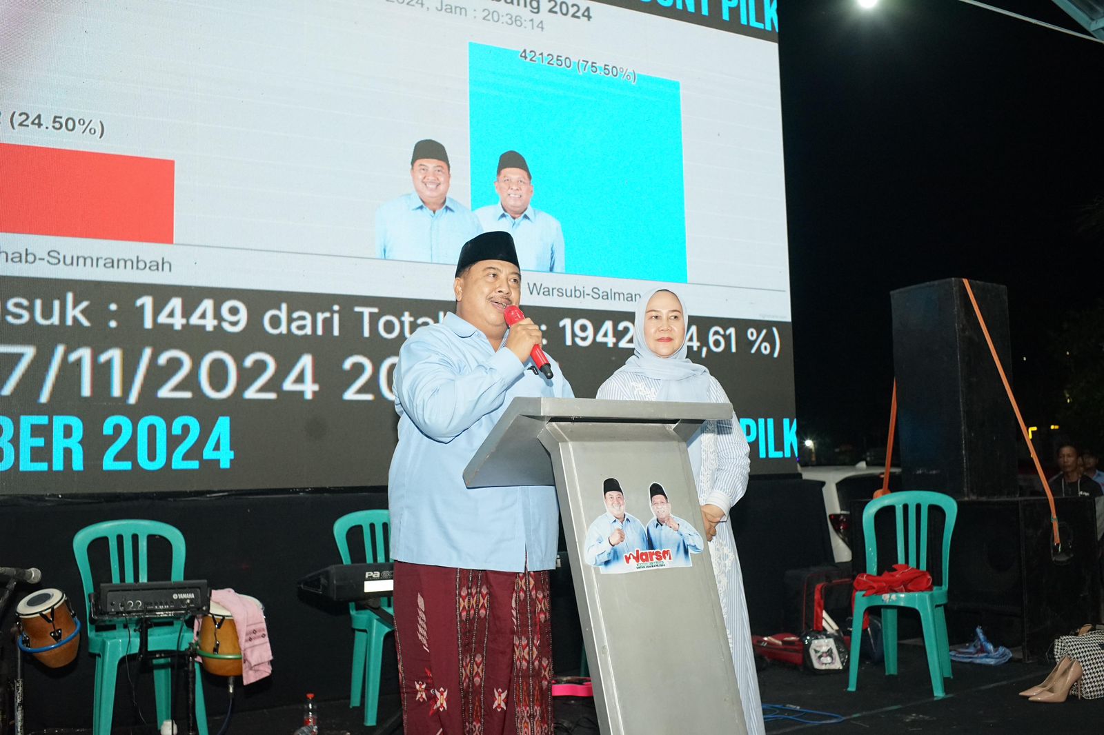 Dari hasil data yang dikumpulkan dari saksi yang masuk di 1349 TPS dari total TPS 1942 atau sebanyak 69,46%, dengan hasil Warsubi-Salman adalah 75,87�n Munjidah-Sumrambah adalah sebesar 24,14%.