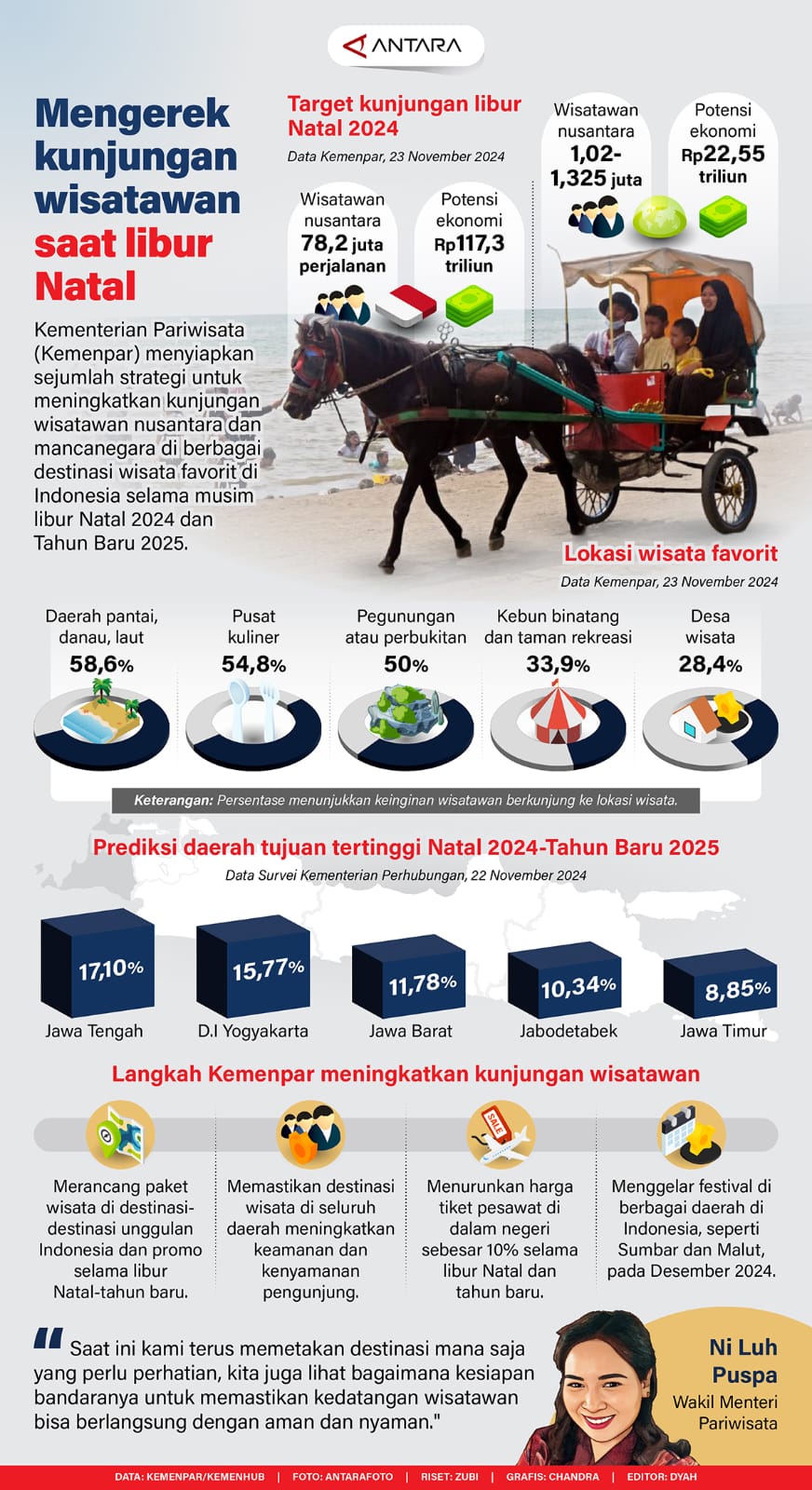 KLIKJATIM.Com | Infografis (Antara) - Kementerian Pariwisata (Kemenpar) menyiapkan sejumlah strategi untuk meningkatkan kunjungan wisatawan nusantara dan mancanegara di berbagai destinasi wisata favorit di Indonesia selama musim libur Natal 2024 dan Tahun Baru 2025. (qom/Ant)