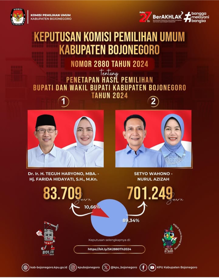 "Jumlah suara sah 784.958 suara, pasangan calon Teguh Haryono-Farida Hidayati mendapatkan 83.709 suara dan Setyo Wahono-Nurul Azizah mendapatkan suara sebanyak 701.249 suara sah," kata ketua KPU Kabupaten Bojonegoro, Robby Adi Perwira.