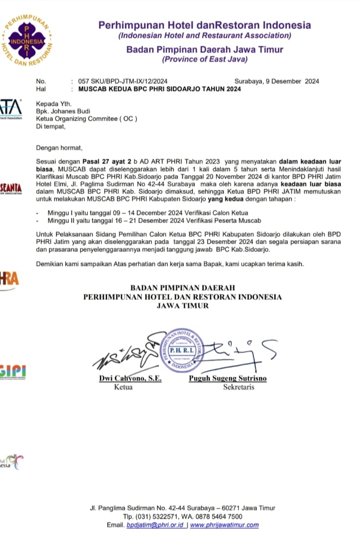 Pada tanggal 09 Desember 2024 terbit surat dari BPD PHRI Jatim dengan nomor surat 057 SKU/BPD-JTM-IX/12/2024 menyatakan bahwa akan ada muscab yang kedua.