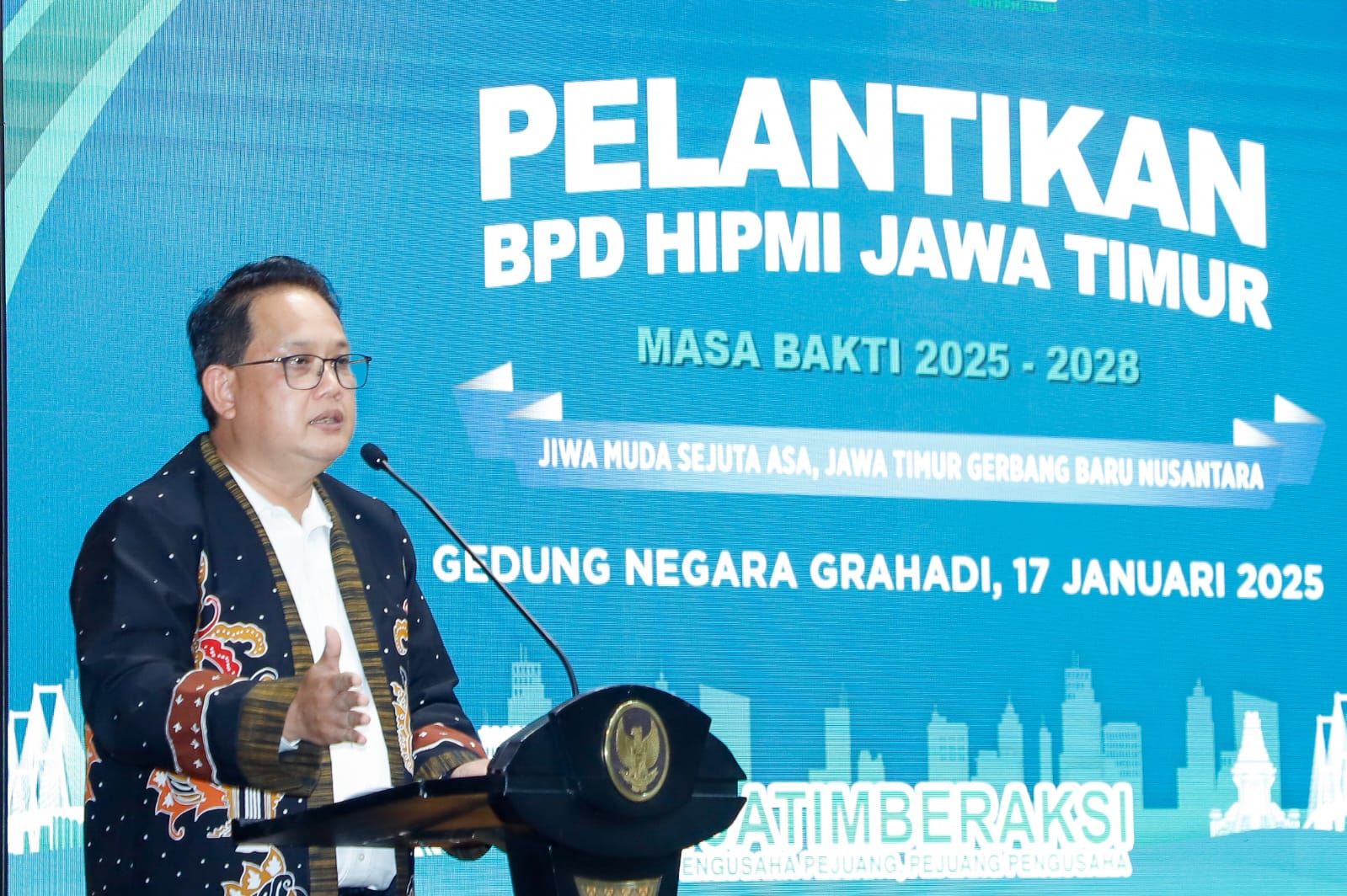 "Kami optimistis kepengurusan yang baru ini akan membawa semangat dan inovasi dalam mendorong kemajuan dunia usaha. Khususnya Usaha Mikro Kecil dan Menengah (UMKM) dan pengusaha muda di Jawa Timur," ujar Penjabat (Pj.) Gubernur Jawa Timur Adhy Karyono saat menyaksikan pelantikan BPD HIPMI Jatim periode 2025-2028 di Gedung Negara Grahadi, Surabaya, Jumat (17/1).
