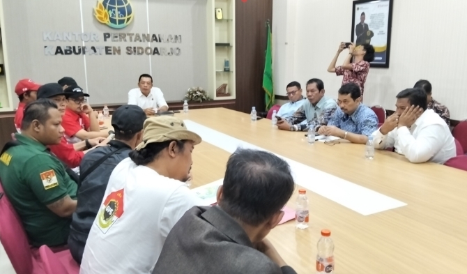 KLIKJATIM.Com | Sidoarjo – Puluhan warga dari berbagai elemen masyarakat mendatangi Kantor Badan Pertanahan Nasional (BPN) Sidoarjo di Desa Rangkah Kidul, Kecamatan Sidoarjo, Kamis (30/1/2025). Mereka menggelar aksi unjuk rasa menolak perpanjangan Sertifikat Hak Guna Bangunan (SHGB) seluas 656 hektare di perairan Desa Segoro Tambak, Kecamatan Sedati.