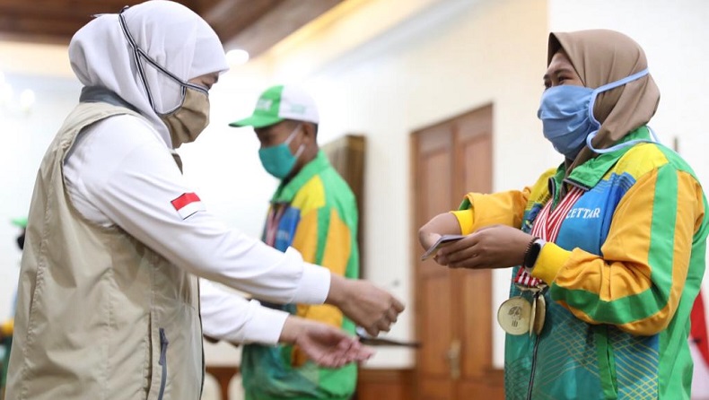KLIKJATIM.Com | Surabaya - Sejumlah atlet peraih medali dalam Pekan Paralimpic Pelajar Nasional (Peparpenas) ke IX-2019 mendapat penghargaan dan tali asih dari Gubernur Jatim, Khofifah Indar Parawangsa, Minggu (19/4/2020). Mereka layak mendapat apresiasi karena telah berprestasi yang berhasil membawa harum nama Provinsi Jawa Timur.