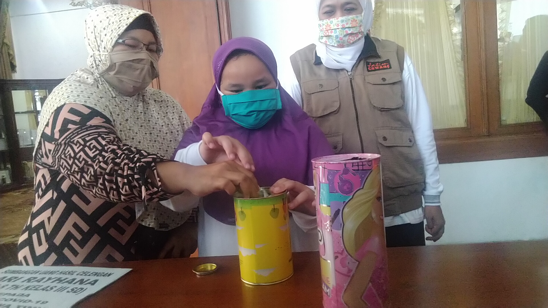 Rayhana memberikan uang hasil tabungannya kepada Gubernur Khofifah ditemani ibunya di Gedung Grahadi, Surabaya. Uang hasil tabungan siswa yang kini duduk di kelas 3 SD itu sebanyak Rp 1 juta.