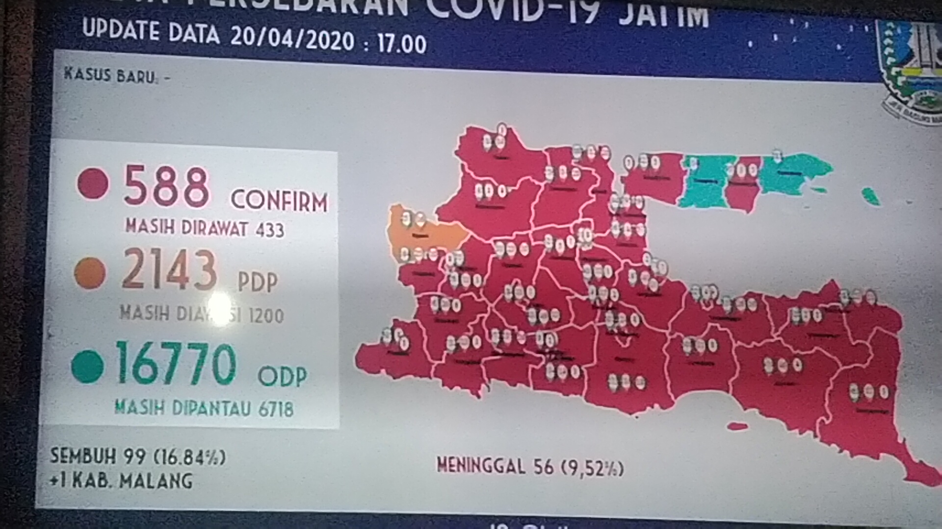 KLIKJATIM.Com | Surabaya—Kasus corona virus disease (covid-19) atau virus corona di Jatim per Senin (20/4/2020) tidak ada tambahan pasien positif. Sebaliknya, ada satu pasien yang sebelumnya positif kini telah dinyatakan telah sembuh.