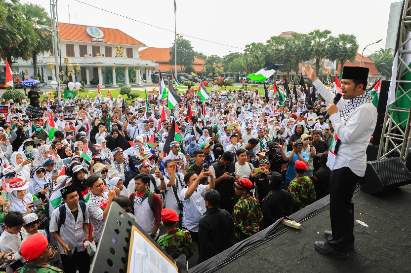 KLIKJATIM.Com | Surabaya - Wakil Gubernur Jawa Timur Emil Elestianto Dardak menyampaikan orasi penuh semangat dalam Aksi Damai Bela Palestina yang digelar di depan Gedung Negara Grahadi Surabaya, Sabtu (19/4).
