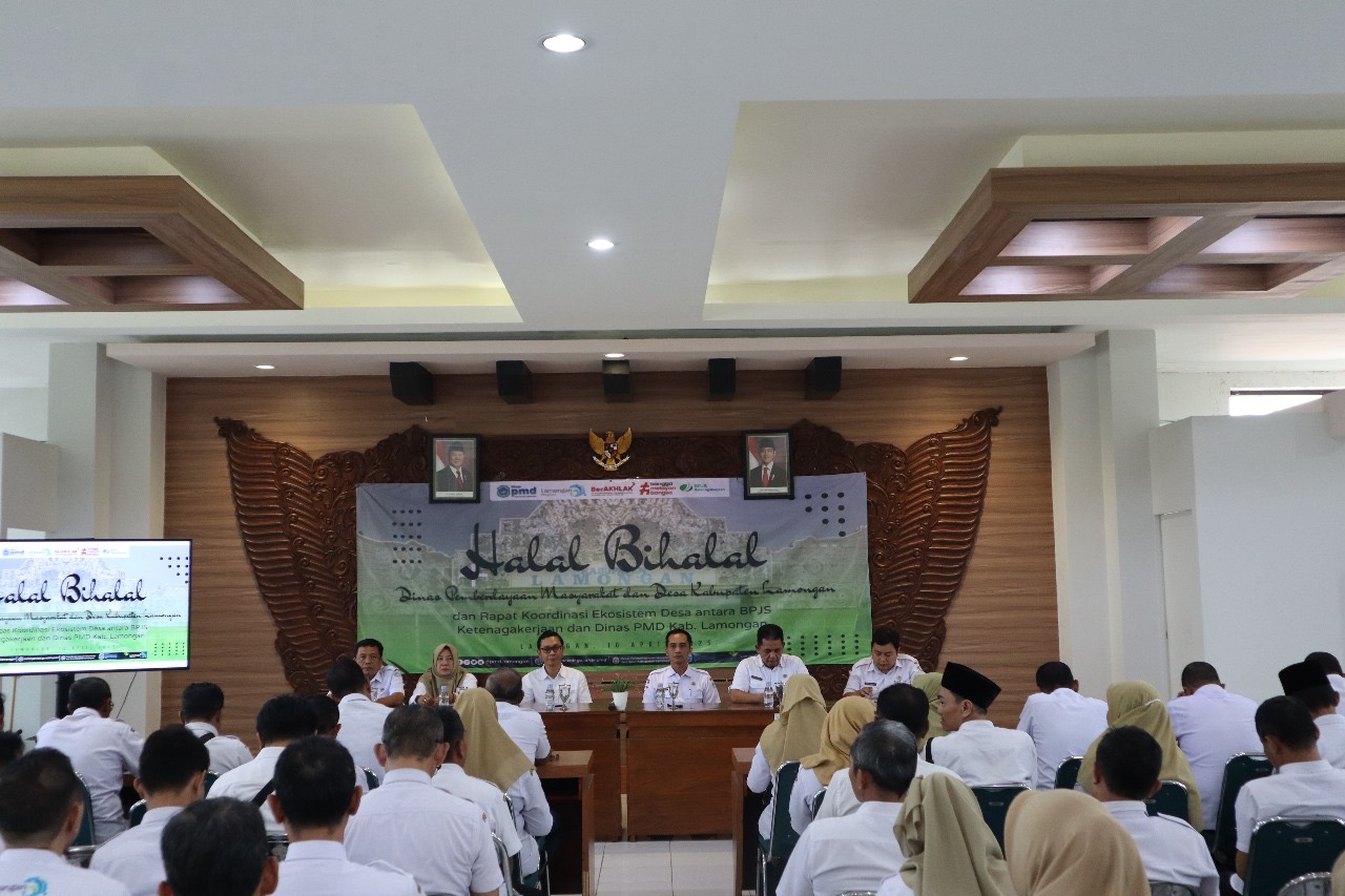 KLIKJATIM.Com | Lamongan - Badan Penyelenggara Jaminan Sosial (BPJS) Ketenagakerjaan Lamongan mengadakan rapat koordinasi dengan Dinas PMD Kabupaten Lamongan serta Kasi Pemerintah dan Kasi PPM (Pembangunan dan Pemberdayaan Masyarakat) Kecamatan Kabupaten Lamongan serta sekaligus kegiatan halal bihalal.