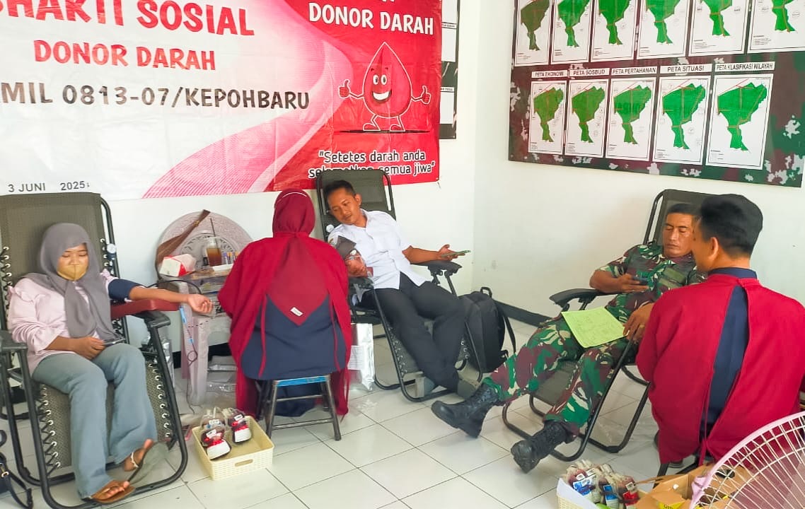 KLIKJATIM.Com | Bojonegoro – Sebagai bentuk kepedulian terhadap kesehatan masyarakat sekaligus mendukung program kemanusiaan, jajaran TNI dari Koramil 07/Kepohbaru, Kodim 0813 Bojonegoro, menggelar kegiatan bakti sosial donor darah pada Selasa (3/6/2025).