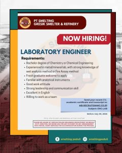 - Pengalaman di laboratorium logam/mineral, terutama metode analisis basah atau Uji Api menjadi nilai tambah