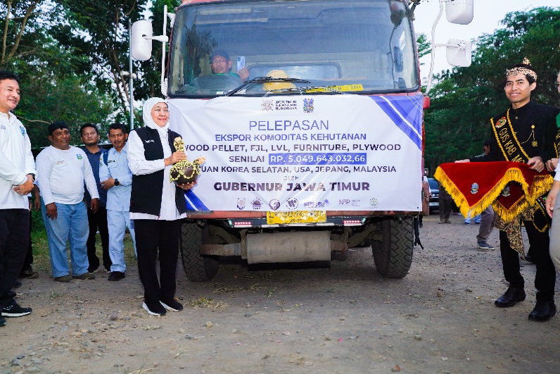 KLIKJATIM.Com | Mojokerto - Gubernur Jawa Timur Khofifah Indar Parawansa Kemudian melepas secara simbolis ekspor komoditas kehutanan senilai Rp5 Miliar. Negara tujuan ekspor meliputi dengan tujuan juan Korea Selatan, Amerika Serikat, Jepang, dan Malaysia.