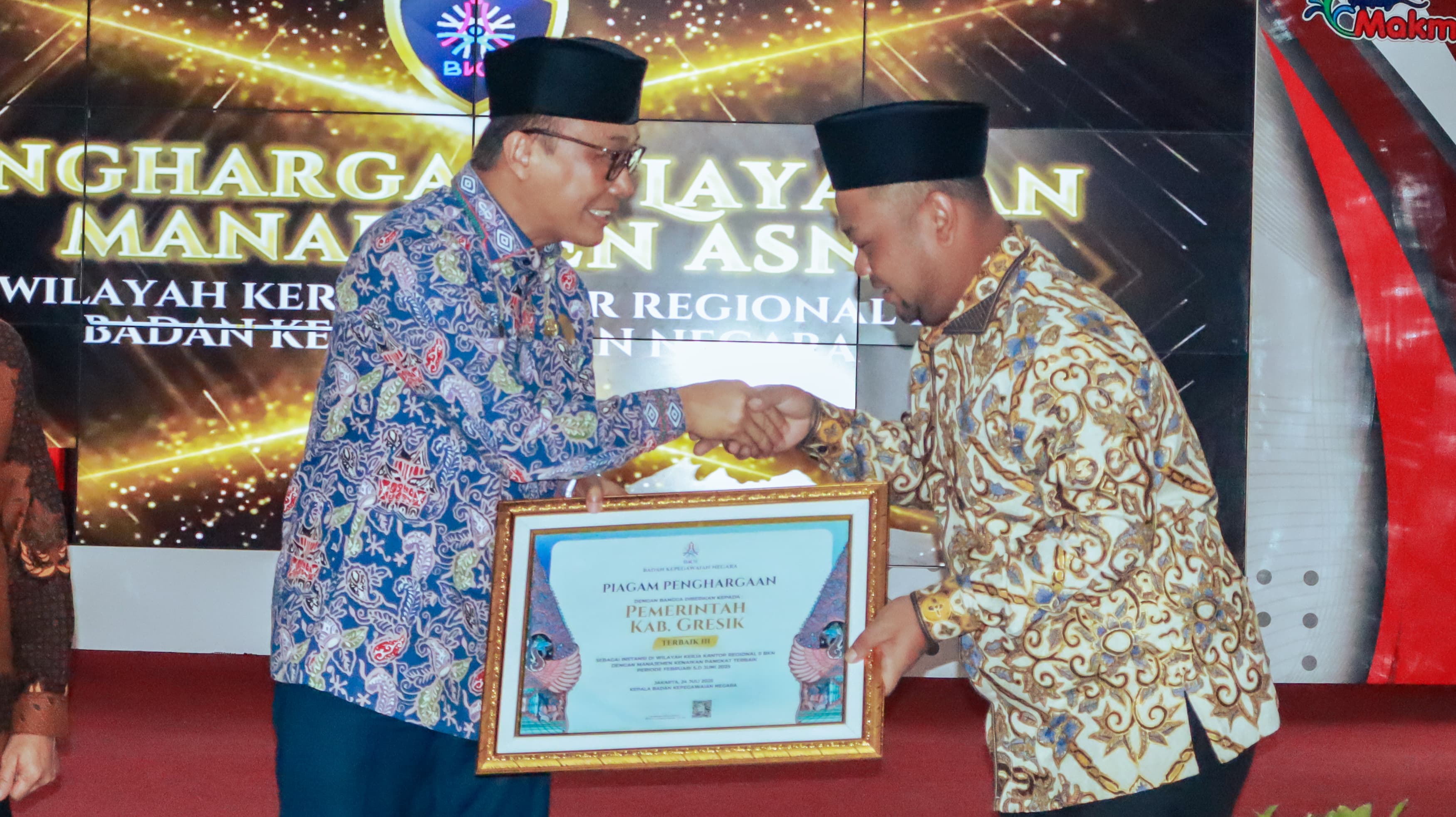 Penghargaan diserahkan secara langsung oleh Kepala BKN RI, Prof. Zudan Arif Fakrulloh, yang didampingi oleh Kepala Kantor Regional II BKN Surabaya, A. Darmuji, kepada Bupati Gresik, Fandi Akhmad Yani.