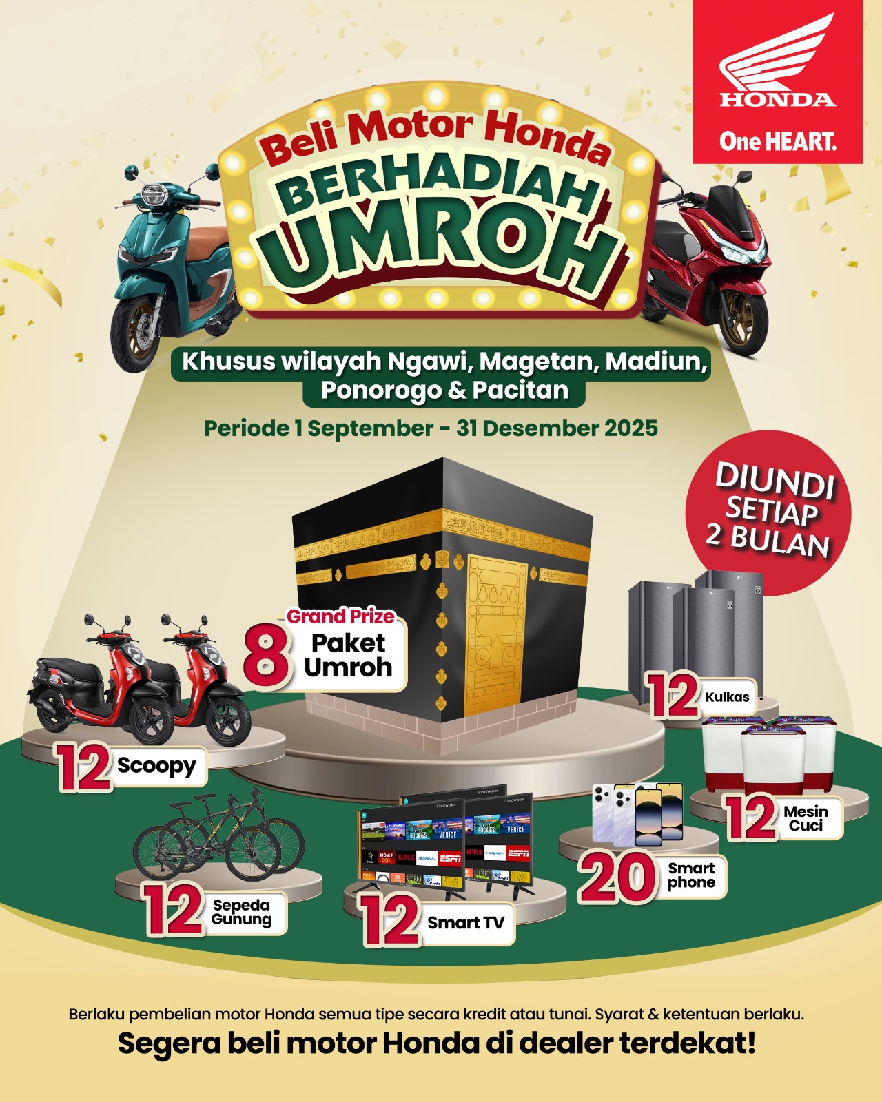 KLIKJATIM.Com | Madiun - PT. Mitra Pinasthika Mulia (MPM Honda Jatim) distributor sepeda motor Honda wilayah Jatim & NTT bersama jaringan dealer Honda wilayah Ngawi, Magetan, Madiun, Ponorogo, dan Pacitan menghadirkan program apresiasi spesial bagi konsumen setia Honda. Mulai 1 September hingga 31 Desember 2025, setiap pembelian motor Honda berkesempatan mengikuti undian berhadiah spektakuler dengan hadiah utama berupa paket umroh.