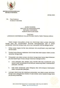 Surat edaran Menteri Ketenagakerjaan Republik Indonesia (Dok/Disnaker Gresik)[/caption]Dalam surat edaran tersebut ditegaskan bahwa setiap warga negara berhak atas pekerjaan yang layak, pemberi kerja dilarang melakukan diskriminasi dalam rekrutmen, dan persyaratan usia hanya diperbolehkan jika berkaitan langsung dengan karakteristik pekerjaan. Ketentuan ini juga berlaku bagi penyandang disabilitas.