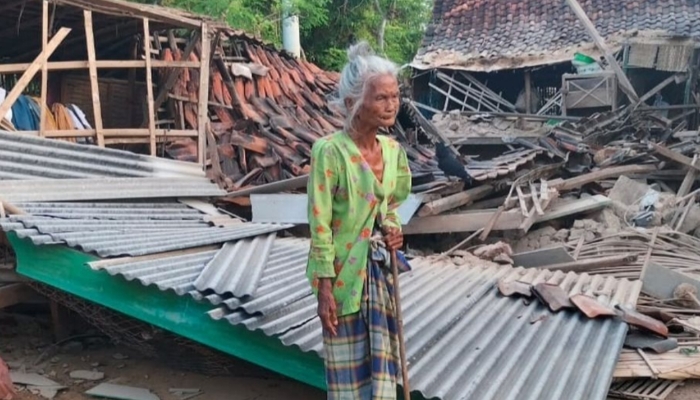 MERATAP. Seorang warga lanjut usia berdiri di depan rumahnya yang rata dengan tanah akibat guncangan gempa di Pulau Sepudi, Sumenep. (Istimewa/KLIKJATIM.Com)