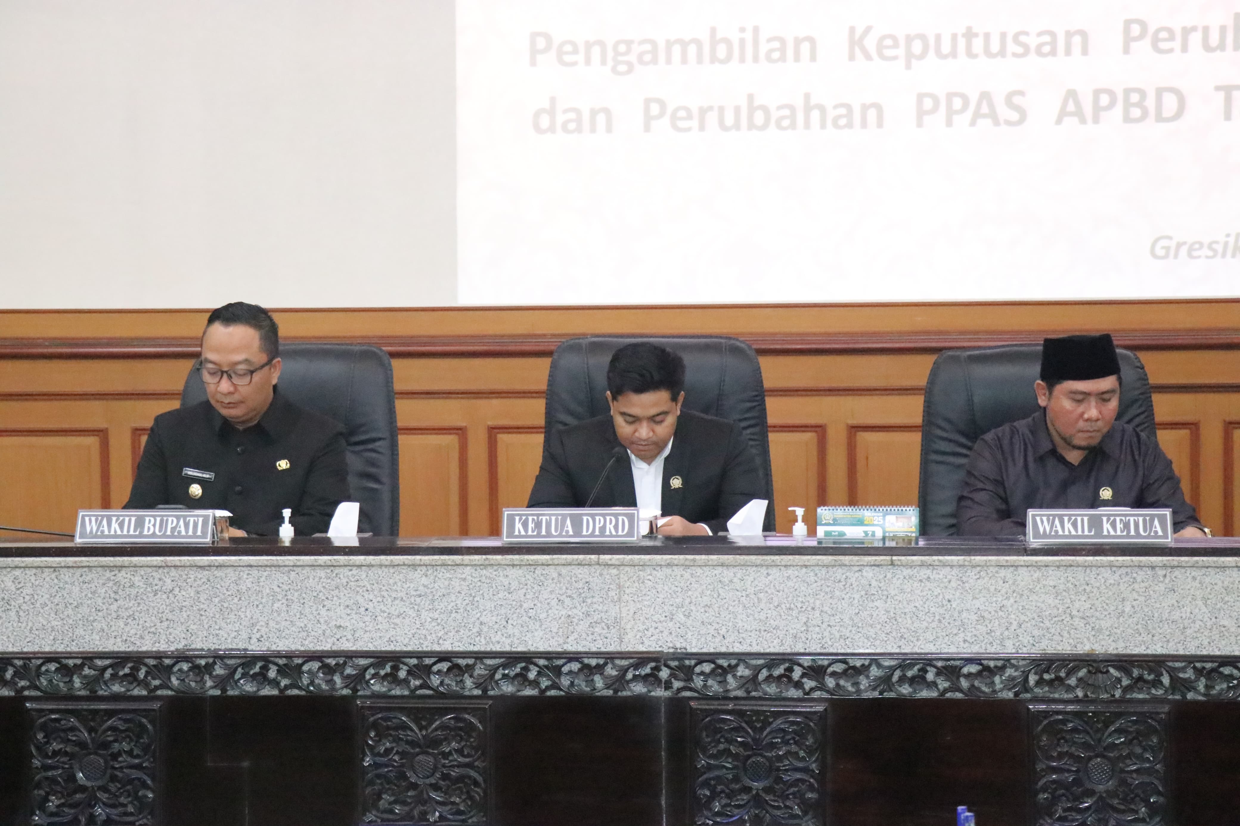 Ketua DPRD Gresik Muhammad Syahrul, bersama Wakil Bupati Gresik dan Wakil Ketua DPRD Gresik Lutfi Dhawam, dalam sebuah rapat paripurna (Qomar/Klikjatim.com)