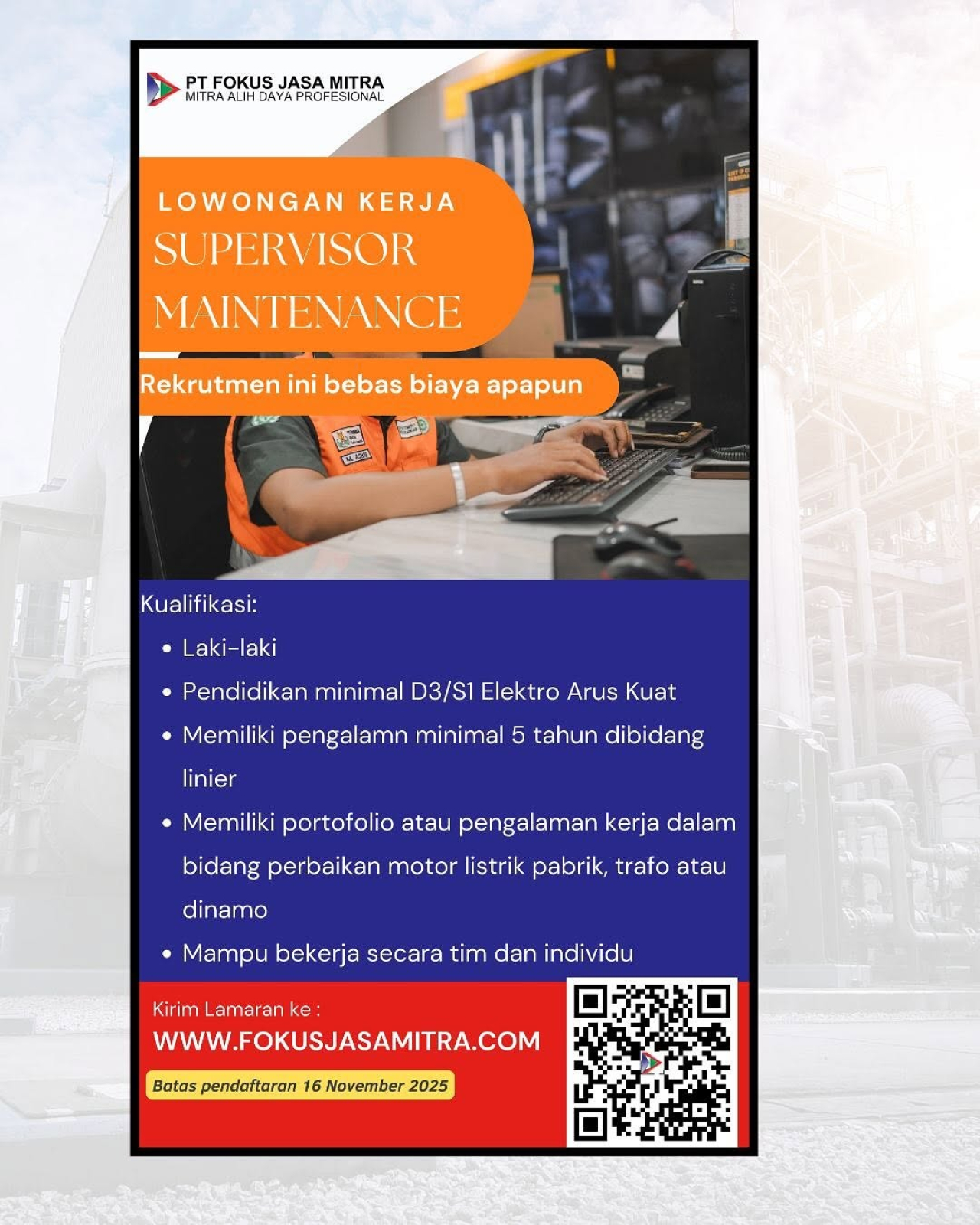 Dua posisi yang ditawarkan yakni Supervisor Maintenance dan Teknisi Listrik, dengan proses rekrutmen bebas biaya apapun.