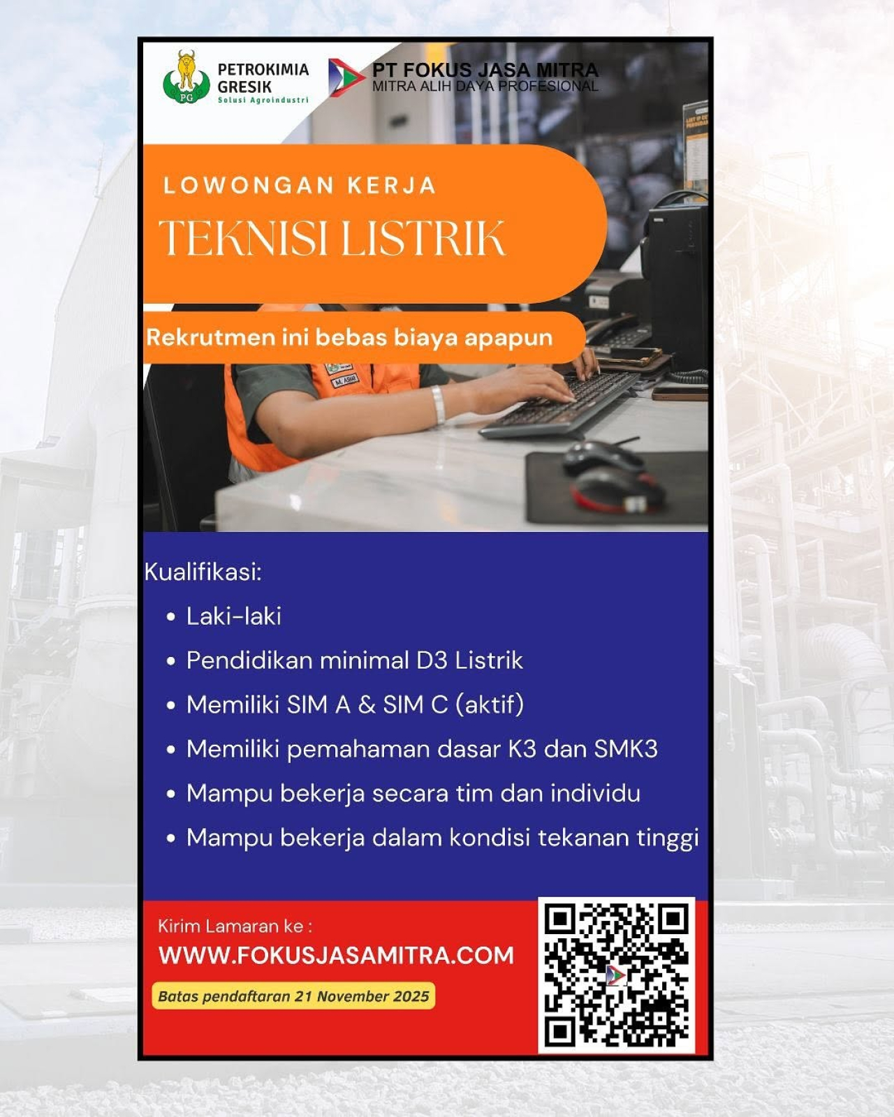 KLIKJATIM.Com | Gresik – PT Fokus Jasa Mitra (FJM), perusahaan penyedia jasa ketenagakerjaan profesional hasil kolaborasi antara Yayasan Petrokimia Gresik dan PT Aneka Jasa Grhadika, membuka kesempatan kerja bagi tenaga teknis berpengalaman.