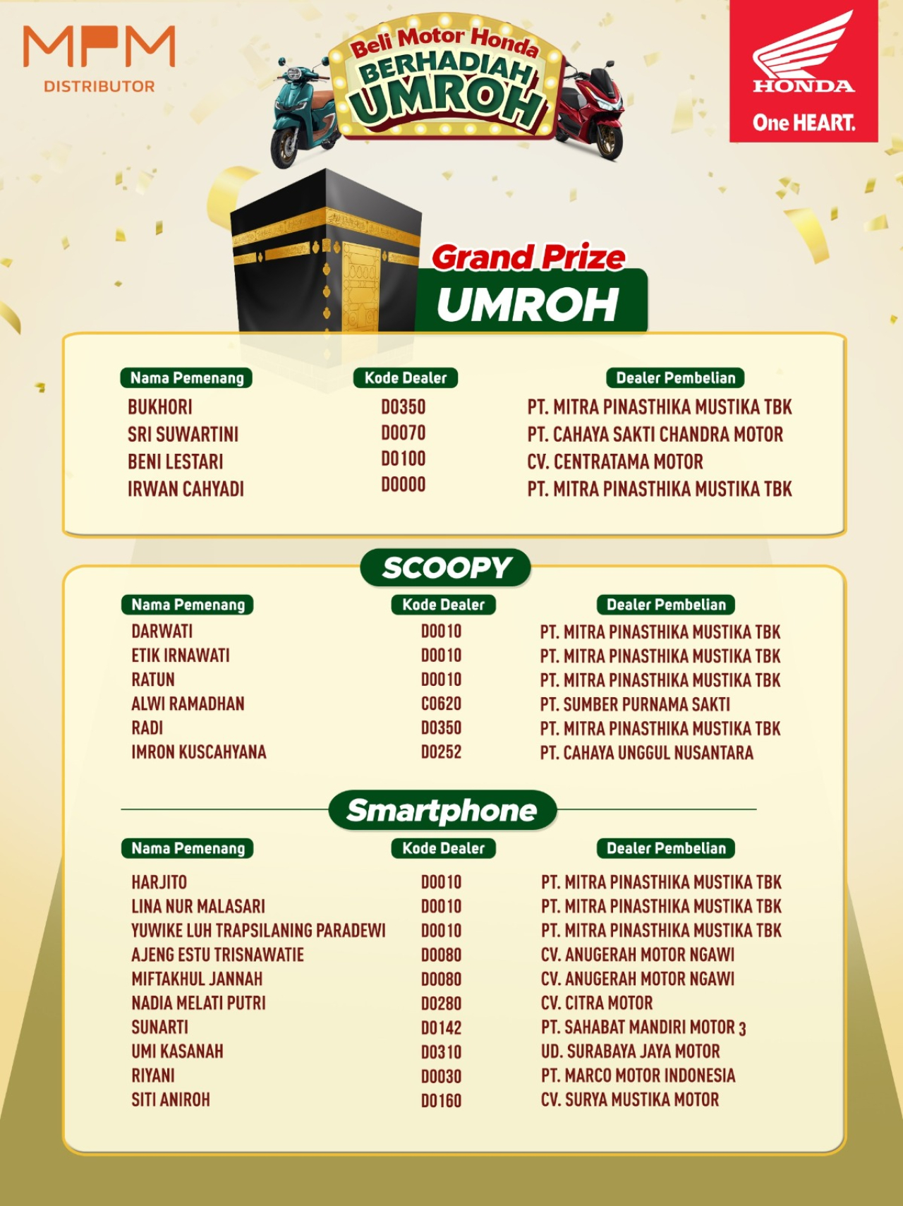 “Program ini merupakan bentuk apresiasi kami kepada konsumen setia Honda yang telah memberikan kepercayaan kepada produk dan layanan Honda. Selamat kepada seluruh pemenang, terutama penerima hadiah utama berupa Paket Umroh. Beli motor Honda sekarang, masih ada kesempatan menang di periode berikutnya! Kami berharap program ini memberikan pengalaman berkesan serta nilai manfaat yang besar bagi konsumen,” ujar Suhari, Marketing Communication & Development Division Head MPM Honda Jatim.