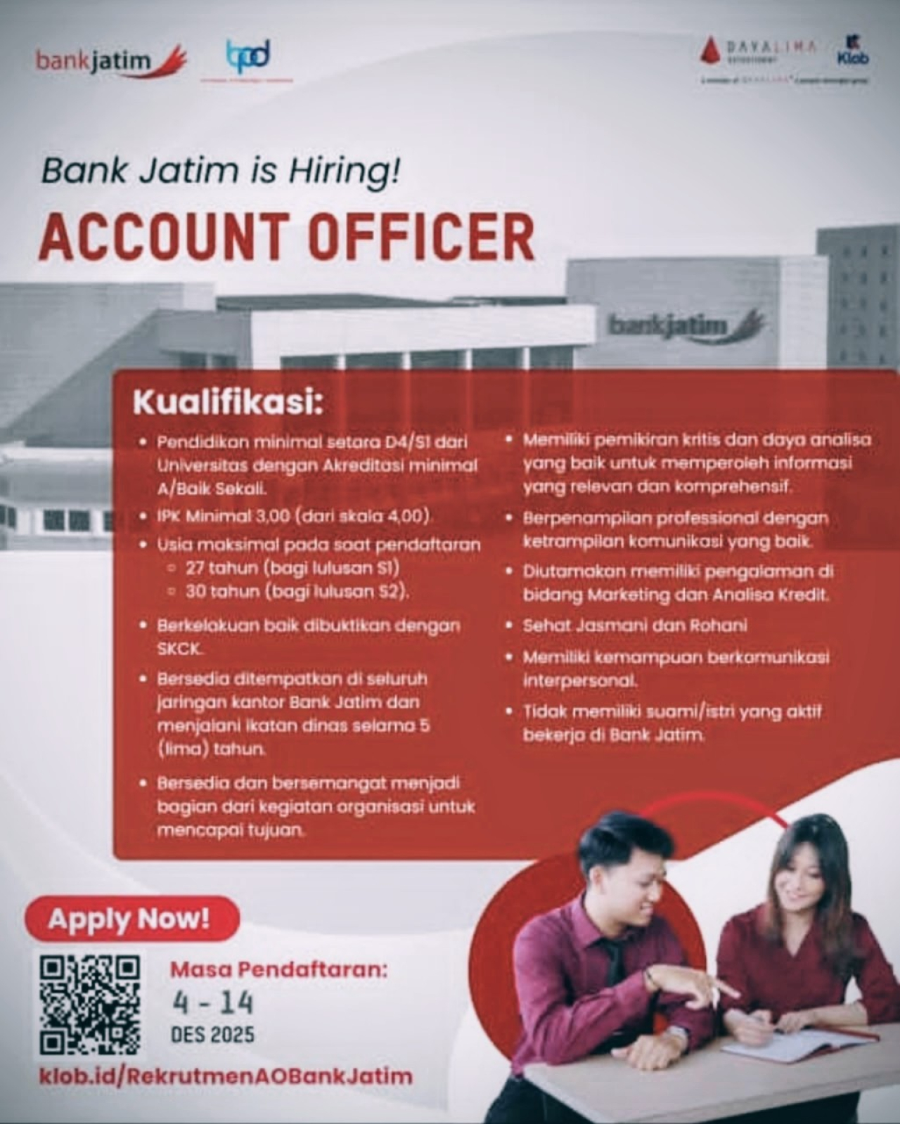 KLIKJATIM.Com | Surabaya — Bank Jatim kembali membuka peluang karier bagi putra-putri terbaik Indonesia melalui rekrutmen posisi Account Officer. Lowongan ini ditujukan bagi para profesional muda yang memiliki kompetensi, integritas, serta semangat untuk berkembang bersama Bank Jatim.